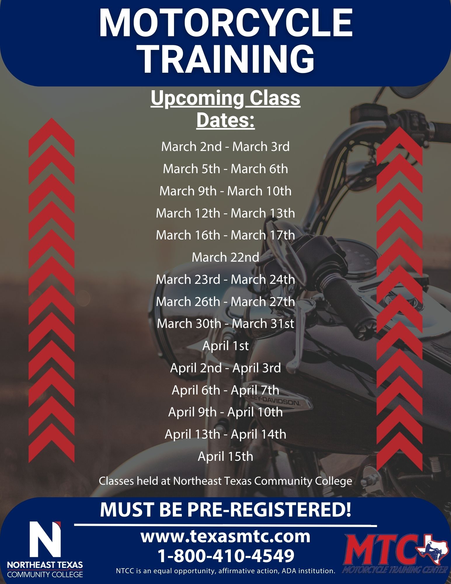 Tuesday, April 2 - Wednesday, April 3 Event Details Contact Person Motorcycle Training Center Contact Phone# 972-242-0300 Contact Email mtcstaff@gmail.com